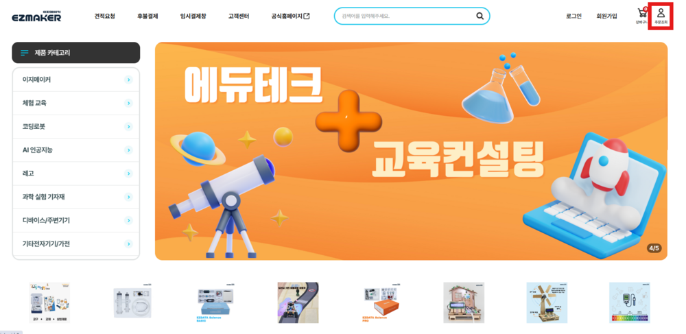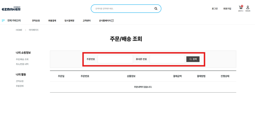 1. 이지메이커몰 메인 화면에서 오른쪽 상단의 주문 조회 버튼 클릭!