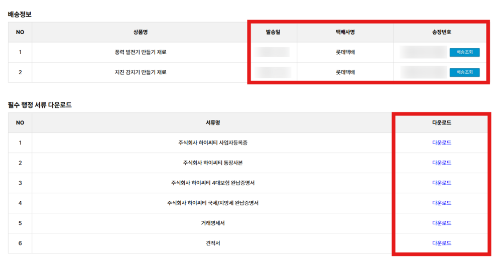 5. 스크롤을 아래로 내리면 배송 정보를 확인할 수 있고 필수 행정 서류도 다운로드 할 수 있습니다 :)
