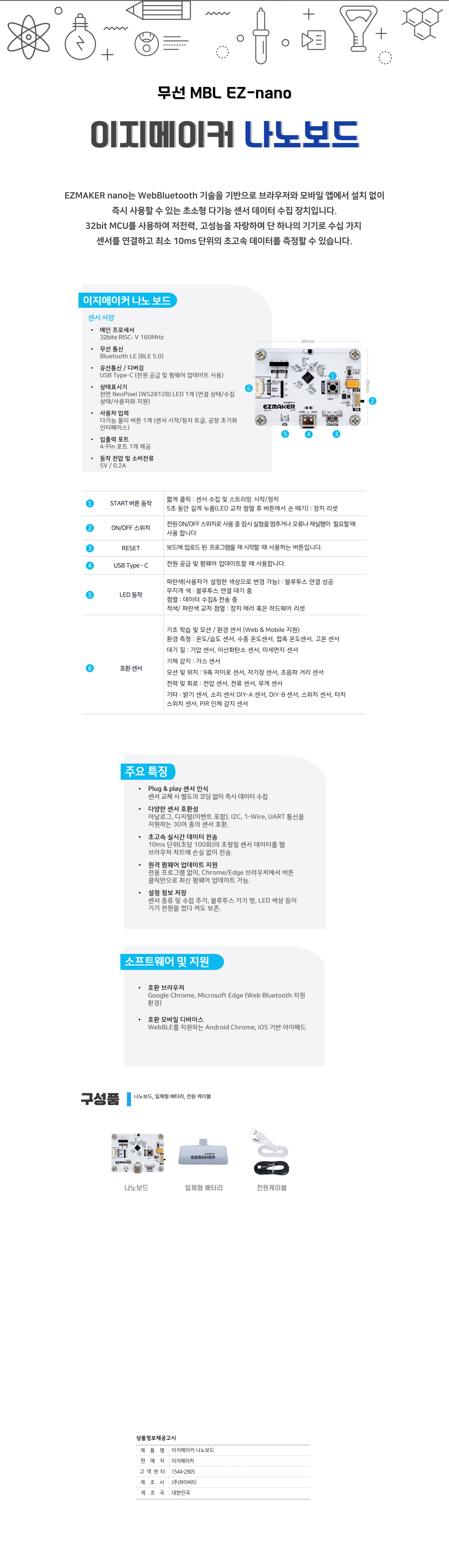 이지메이커 나노보드는 WebBluetooth 기술을 기반으로 브라우저와 모바일 앱에서 설치 없이 즉시 사용할 수 있는 초소형 다기능 센서 데이터 수집 장치입니다